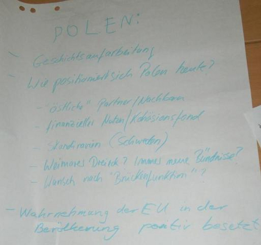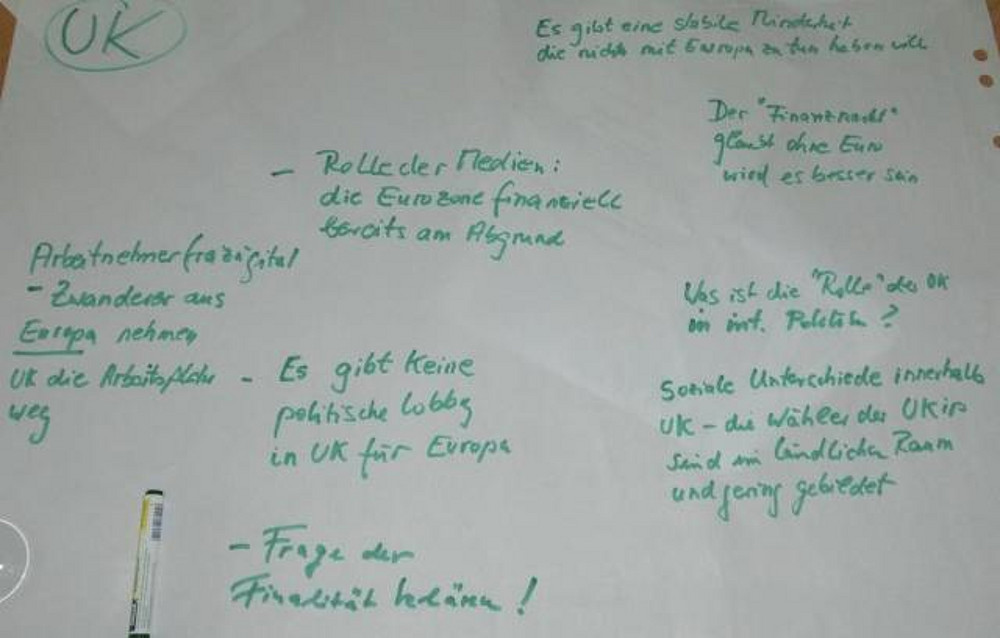 Zu Beginn des Seminars präsentierten die eingeladenen Experten in Impulsreferaten die Sicht ihres jeweiligen Landes. Richard Stock, Generaldirektor des Europa-Zentrums Robert Schuman in Scy-Chazelles, sprach über fünf Arten von Ansichten über Europa in Frankreich. Die Briten Grahame Lucas, Abteilungsleiter bei der Deutschen Welle und Victoria Appelbe, Wirtschaftsförderin der Stadt Bonn, ließen die Ereignisse vor der britischen EU-Mitgliedschaft Revue passieren und erklärten die Hintergründe für die viel zitierte Euroskepsis. Im Lichte der aktuellen Positionen der Politiker auf der Insel boten sie einen Ausblick auf mögliche Zukunftsszenarien. Schließlich erörterte Vizekonsul Andrzej Dudziński vom polnischen Generalkonsulat in Köln die Entwicklung Polens seit dem Beitritt. Unterstützt wurde er von Roswitha Köhlert, Stellvertretende Vorsitzende der Deutsch-Polnischen Gesellschaft Köln/Bonn.