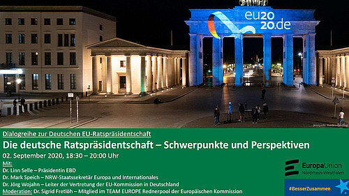 Am Mittwoch, dem 02. September lädt die Europa-Union NRW von 18:30 bis 20 Uhr herzlich zu einer Online-Diskussion zum Thema „Die deutsche Ratspräsidentschaft – Schwerpunkte und Perspektiven“ ein. Zu Gast sind Dr. Linn Selle, Präsidentin der Europäischen Bewegung Deutschland, Dr. Mark Speich, Staatssekretär für Bundes- und Europaangelegenheiten im Land NRW, und Dr. Jörg Wojahn, Leiter der Vertretung der Europäischen Kommission in Deutschland zu. Die Moderation übernimmt Dr. Sigrid Fretlöh, Mitglied im TEAM EUROPE Rednerpool der… » weiterlesen