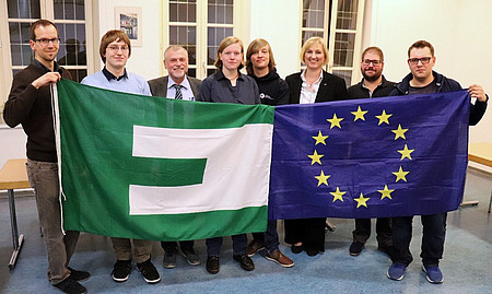 Bild des neuen Vorstandes zusammen mit Peter W. Wahl (Landesvorsitzender der Europa-Union) und Kirsten Eink (Landesgeschäftsführerin) von links; Jakob Steffen, Daniel J. Ockelford, Peter Wahl, Amelie Müller, Dave Merkel, Kirsten Eink, Dimitrios Athanassiou, Ulf Lietz