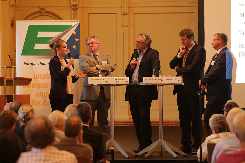In der einführenden Podiumsdiskussion fragte Moderator Jürgen Zurheide, wie das Bild Europas angesichts der Konflikte in der europäischen Flüchtlingspolitik und wachsender populistischer Tendenzen wieder verbessert werden könne. „Europa ist nicht das Problem, sondern die Lösung“, erklärte Jörg Bentmann vom Bundesinnenministerium. Die EU sei kein Verwaltungs- sondern ein Zukunftsprojekt. Dies müsse man den Menschen vermitteln. Gerade der Brexit führe vor Augen, welche Vorteile einem Mitgliedsland bei einem Austritt verloren gingen und was die EU an Positivem beinhalte. Mit Blick auf die aktuelle europäische Asyldebatte sagte Matthias Oel von der Europäischen Kommission: „Wir brauchen Fortschritte. Die Bürger wollen, dass es vorangeht.“ Die Vorschläge lägen auf dem Tisch, nun müsse an Kompromissen gearbeitet werden. Thorsten Klute, Staatssekretär für Integration im Ministerium für Arbeit, Integration und Soziales NRW, verwies auf die Bedeutung des Austauschs in Europa. Durch Städtepartnerschaften könnten noch mehr Menschen Europa erleben. Es gebe durchaus viele junge Leute, die für Europa brennen, sagte die grüne Europaabgeordnete Terry Reintke. Sie wollten Europa jedoch mitgestalten. Noch habe die EU das Gerechtigkeitsversprechen nicht in vollem Umfang eingelöst. Ihre Forderung nach mehr sozialer Gerechtigkeit traf beim Publikum auf große Zustimmung.