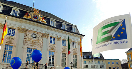 Vor dem Bonner Rathaus wurde (Europa-)Flagge gezeigt, Luftballons verteilt und (gelegentlich) gesungen, ein offenes Mikrofon bot einigen Gelegenheit für Erlebnisberichte, Appelle und Zukunftswünsche für Europa. Eine Menschenkette um den Platz war wegen der Anzahl auf dem Marktplatz zwar nicht einfach machbar, aber bei dem Versuch kam man auch ins Gespräch.