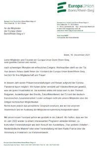 In diesem Jahr waren Präsenzveranstaltungen und Reisen aufgrund der Corona-Pandemie kaum möglich. Wir haben daher verstärkt auf Videokonferenzen gesetzt, was ein gutes Ersatzmittel ist. Sie konnten online mit dabei sein zu den Themen Bulgarien, Auswirkungen des Brexits, Zukunftskonferenz der EU und der deutsch-französischen Zusammenarbeit. Leider verfügen nicht alle unsere Mitglieder über die nötigen technischen Möglichkeiten.